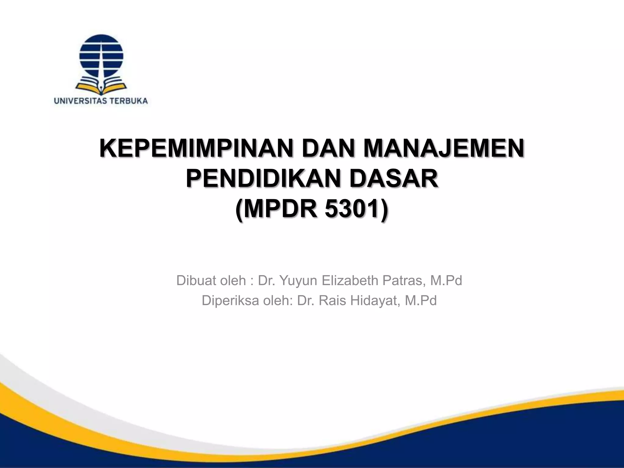 Dokumen ini menjelaskan konsep dasar manajemen dalam konteks pendidikan dasar, termasuk pengertian dan fungsi manajemen. Terdapat berbagai tipe manajemen dalam organisasi serta sudut pandang dan pendekatan yang berbeda. Fungsi-fungsi manajemen diringkas menjadi empat elemen kunci: perencanaan, pengorganisasian, pengarahan, dan pengawasan.
