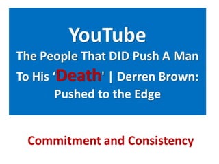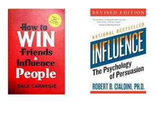 1. The document discusses various techniques for increasing influence over others, including telling stories, using body language, tone of voice, building trust through similarity and credibility, and leveraging psychological concepts like reciprocity, social proof, and scarcity.