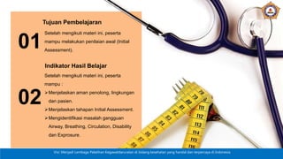 2. Dokumen tersebut menjelaskan langkah-langkah melakukan penilaian awal mulai dari survei primer, sekunder, dan tahapan penilaian.