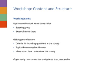 This document summarizes a workshop about developing a feedback survey for postgraduate taught students. The workshop aimed to get participant views on criteria for questions, topics the survey should cover, and how to structure the survey. Suggested themes included quality of teaching, learning and teaching, intellectual challenge, skills development, and student support. Participants provided input on important topics, irrelevant topics, and how to order and structure questions for different audiences and purposes like program enhancement, student choice, and accountability. The timeline for developing and piloting the survey was also discussed.