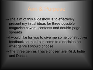 Sam presented initial ideas for 3 magazine genres - R&B, dance, and indie. Peers provided feedback on the genres, suggesting adding red to the R&B color scheme and changing the dance chart and colors. They concluded that an indie magazine was the best idea, liking the colors, language, and images, but recommending changing the age range and story topics, and suggested the name "RADAR".