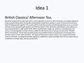 The document contains feedback from Charlotte Shaw on 5 initial recipe card ideas. The ideas focus on different target audiences including older generations, students, children, those looking to become vegetarian, and singles. The feedback provides suggestions on what is liked about each idea, areas for improvement, and what is found interesting. Charlotte agrees that font details and finishing techniques need more specifics. While mixed media on children's cards could be messy, laminating prevents this. Advertising may not require a strong focus but social media could work for students. Charlotte's favorite idea is recipe cards for children and parents to use as a learning tool. The favorite among the group's ideas is family meals incorporating tips for all ages.