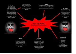 The document outlines the key details of a short horror film called "The Woods" including: - The opening scene will show an actor swinging on a swing that then disappears from the swing. - The film takes place in woods outside a college and will be around 2 minutes long. - Props include a scarecrow mask, ragged clothes, and a torch. - Audio will be eerie to increase suspense and worry for the audience. - Equipment includes a camera, tripod, computer, editing software, and music software.
