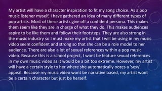 The document outlines initial ideas for a pop music video project for school. The artist in the video will portray a confident persona to act as a role model for audiences. While pop music videos often include sexual references, the student's video will avoid this due to it being a school project but will feature a stylish artist that exudes sex appeal. The video will be concept-based and feature the artist lip syncing and performing actions at various indoor and outdoor locations to keep it upbeat. Some shots may be difficult to capture due to busy areas so less crowded aesthetic locations will be used.