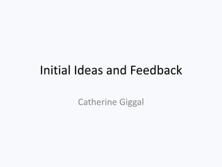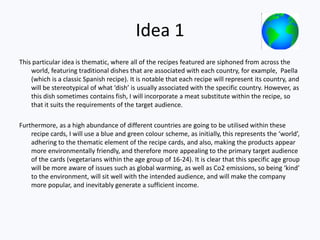 The document contains feedback from Catherine Giggal on 5 different ideas for recipe cards with themes. The ideas include: 1) recipes from different countries represented by stereotypical dishes, 2) popular dessert recipes with some vegan options, 3) Easter themed recipes featuring eggs and spring colors, 4) a space themed idea targeting young boys with dishes like rocket salad, and 5) traditional British dishes like sausage and mash made with meat substitutes. The feedback provides positive comments on the details and themes of each idea, with some suggestions to further develop color schemes or layouts. Catherine agrees with targeting audiences and simple ideas to appeal to many, and disagrees that color schemes were not fully developed in some cases.
