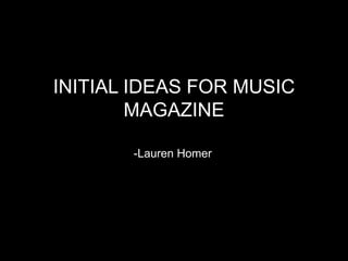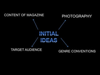 Lauren Homer is developing ideas for her indie music magazine. She plans to feature photography of local indie bands performing taken with close-up, mid, and low angle shots. For photos, she wants a contrast of dark lighting for band performances and brighter lighting so the magazine does not seem dull. Photos will be set in venues or of bands outside holding instruments. Costumes will reflect typical indie styles like flannel and skinny jeans. The target audience is ages 11-20, most respondents were female, and featured bands will be primarily British indie acts. Main stories will cover fashion, new bands, bands touring in 2016, and the appeal of indie music.
