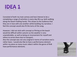 This document discusses potential concepts for a music video. The first concept involves the main actress and love interest walking on the beach holding hands to portray their love, but filming at the beach would be difficult. The second concept is solely a narrative of the couple arguing and the actress crying over photos, but it is too basic and negative. The third involves only a dance performance by the couple, but it risks becoming repetitive and finding the right male dancer would be difficult. The final concept proposed incorporates both a narrative and performance elements by alternating between scenes of the couple intimate at home as the song is sung and the actress dancing while being watched by her love interest.