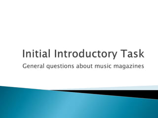 Music magazines are publications dedicated to specific music genres like pop, rock, and hip hop. They contain news, interviews, reviews and photos related to artists within that genre. Readers expect to see images of musicians associated with the genre as well as content reflecting the target audience. Magazine covers aim to attract their target readership through large mastheads indicating the genre, central images of famous artists, and headlines about featured content.