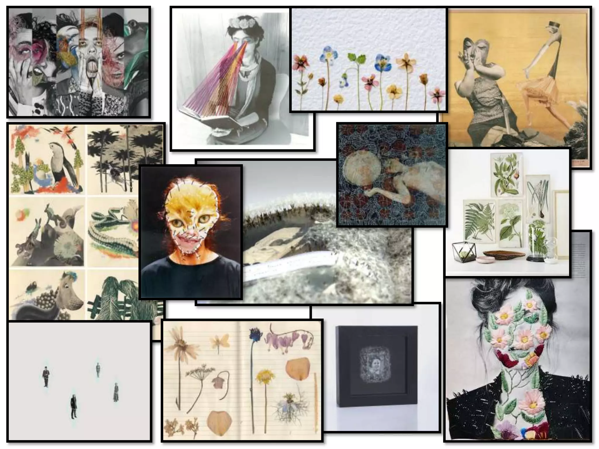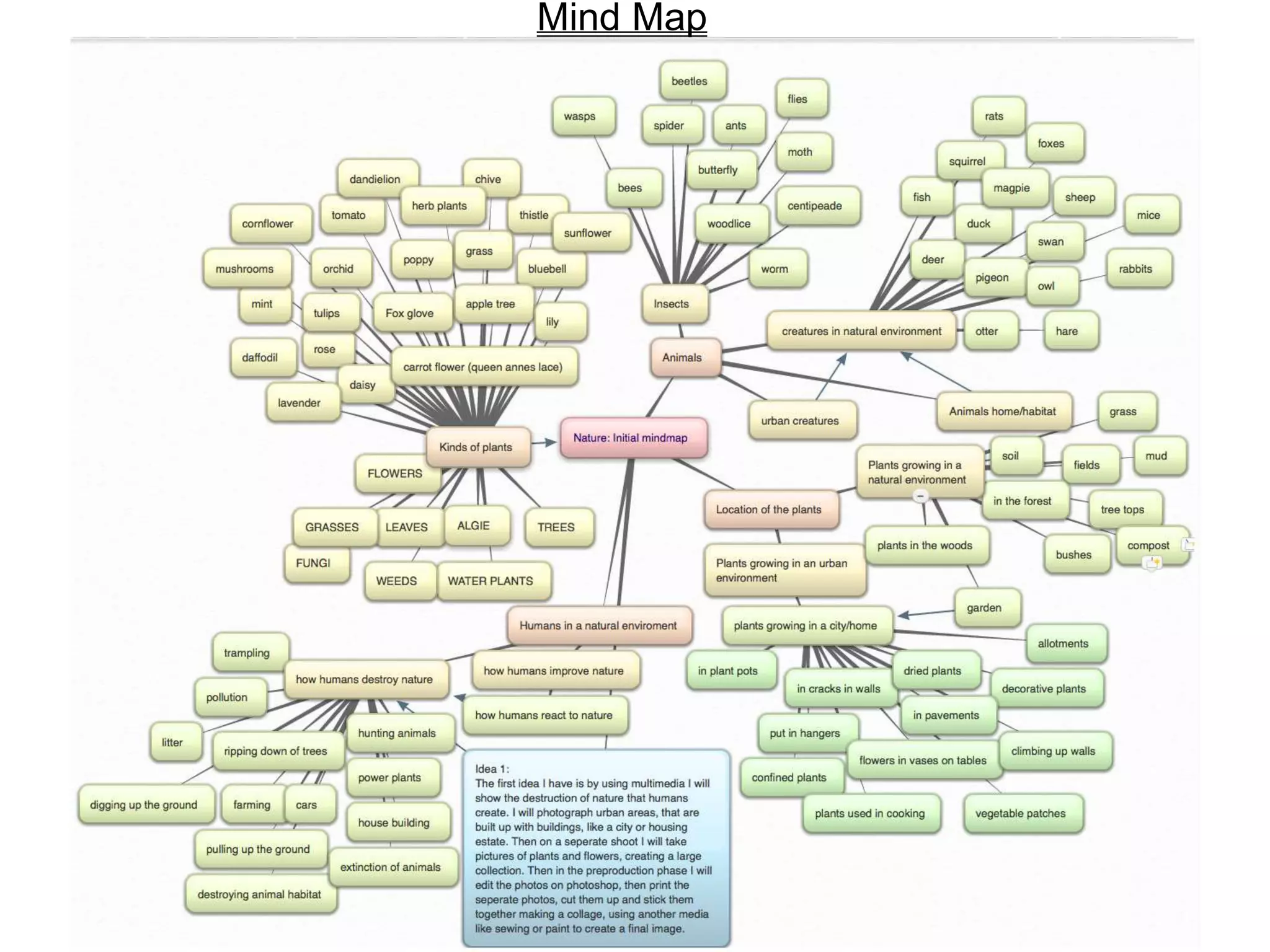 Hannah created a mind map to narrow down her ideas for photographing nature. She decided to focus on plants and flowers, which are easy to find and photograph. The photos will be used in a collage multimedia project, so they need to be clear shots of identifiable subjects. Hannah was inspired by artists who used collage, thread, and pressed flowers in surreal photomontages. For her own project, she plans to create a photomontage showing how nature reclaims what humans have built by using her plant photos, thread, and pressed flowers to depict plants overgrowing abandoned structures.