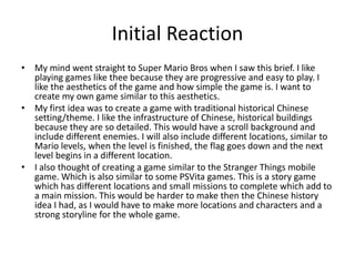 The document provides initial plans and ideas for a video game project. It discusses taking inspiration from Super Mario Bros for the aesthetics and gameplay. The first idea is for a side-scrolling game set in historical China with traditional buildings, enemies, and different levels. The second idea draws inspiration from the Stranger Things mobile game with multiple locations and missions. A third maze-style game idea is also outlined, similar to Pacman. A mind map further develops a final idea for a Chinese history-themed game with a scroll background, traditional outfits and buildings, and dragon enemies. A mood board is also included to inspire the aesthetics with blues and reds. A schedule provides a plan to create prototypes, develop the