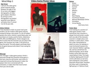 The document provides initial plans and ideas for creating video game, graphic novel, and film/TV posters. It discusses genres, age groups, color schemes, and common poster designs. For video game posters, it notes the modern color schemes of grey, red, and black are used to portray the main character saving the world. It also describes graphic novel and film/TV poster conventions, such as using darker colors for villains. Mood boards are presented showing inspiring poster designs that convey narrative through silhouettes and color splits.