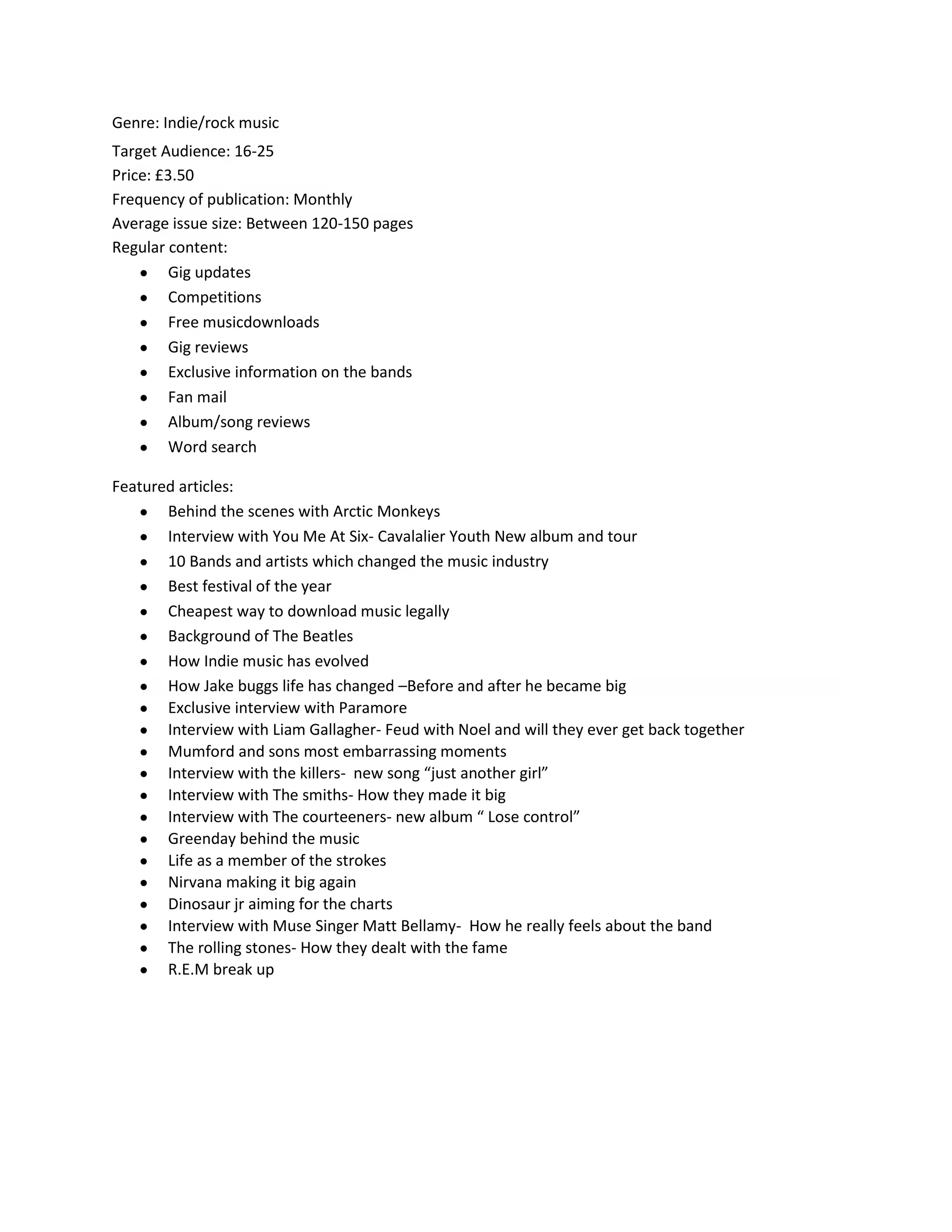 This monthly magazine targets 16-25 year olds interested in indie and rock music. Each issue ranges from 120-150 pages and costs £3.50. It provides regular content such as gig updates, competitions, free music downloads, gig reviews, and fan mail. Feature articles interview popular bands about new albums, tours, and their experiences achieving success or dealing with fame.