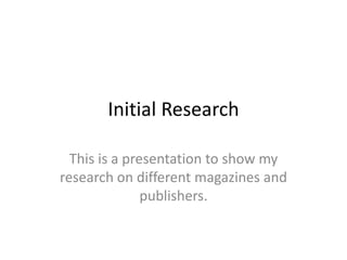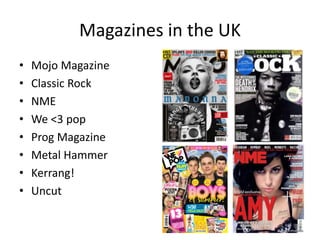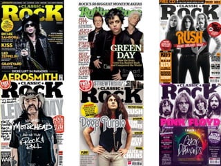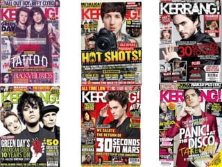 This document summarizes the researcher's analysis of magazine front covers, contents pages, and articles from Kerrang!, Classic Rock, NME, and Mojo magazines. For each magazine element analyzed, the researcher examines design choices like layout, images, colors, text and how these elements work together to engage readers. For example, the Kerrang! front cover uses bold colors and images of bands to attract readers' attention. The NME contents page uses colorful headlines and a small central image to showcase articles. Overall, the analysis provides insights into how magazine publishers design elements to effectively present information and appeal to audiences.