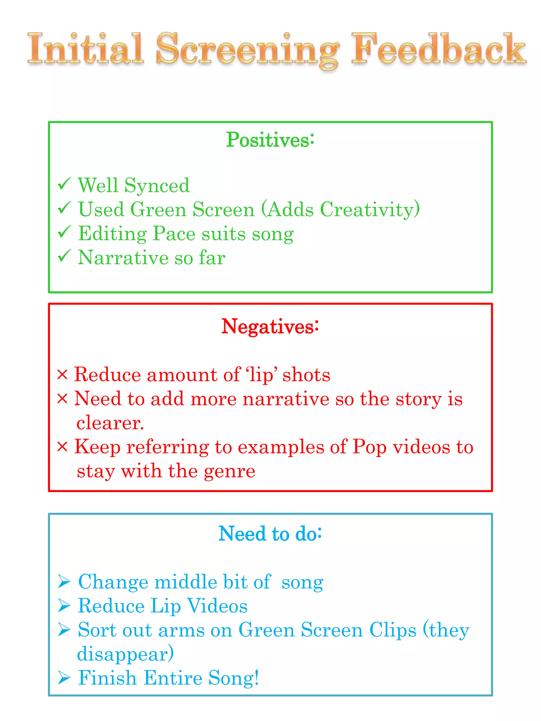The document provides feedback on a music video project, noting positives like well-synchronized editing that suits the song and use of a green screen that adds creativity. However, it recommends reducing lip shots, adding more narrative clarity, and keeping examples of pop videos as references. It identifies tasks like changing the song's middle part, reducing lip videos, fixing disappearing arms in green screen clips, and completing the full song.
