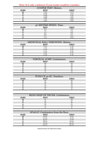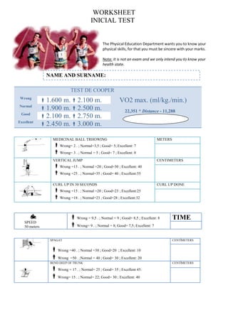 The Physical Education Department provided a worksheet to evaluate students' physical skills and health through various tests without it being an exam. The worksheet includes tests of cooper running, medicine ball throwing, vertical jump, curl-ups, trunk flexibility, speed, and splits. Scoring guidelines are provided to classify performance on each test as wrong, normal, good, or excellent. Reference values for boys and girls are also listed for each test to understand performance levels. The department notes this is only a reference and not an exam to understand one's health state.