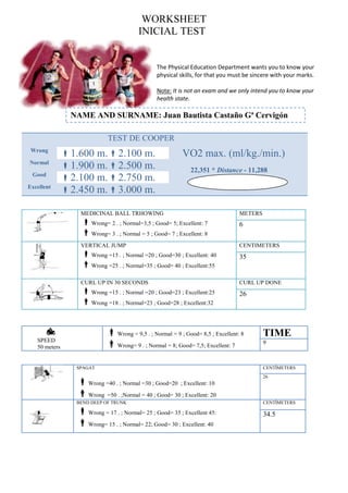 This document contains information about an initial physical skills test administered by a Physical Education department, including benchmarks for various tests. It provides guidelines for test components like the Cooper test, medicine ball throw, vertical jump, curl-ups, speed, flexibility tests, and assigns point values or categories of wrong, normal, good, and excellent. The bottom of the document contains sample results for a student named Juan Bautista Castaño Ga Cervigón and benchmarks for interpreting results on the various tests.