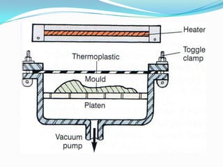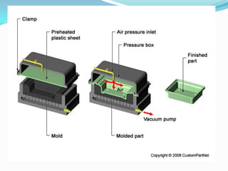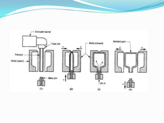 The document discusses different plastic processing methods used by group members Muazz Ali and Irfan Ali. Muazz Ali focuses on injection molding, blow molding, and injection blow molding. Irfan Ali discusses extrusion blow molding, stretch blow molding, and thermoforming. Both members provide details on the basic principles, processes, parameters, advantages, disadvantages and applications of each plastic processing technique.