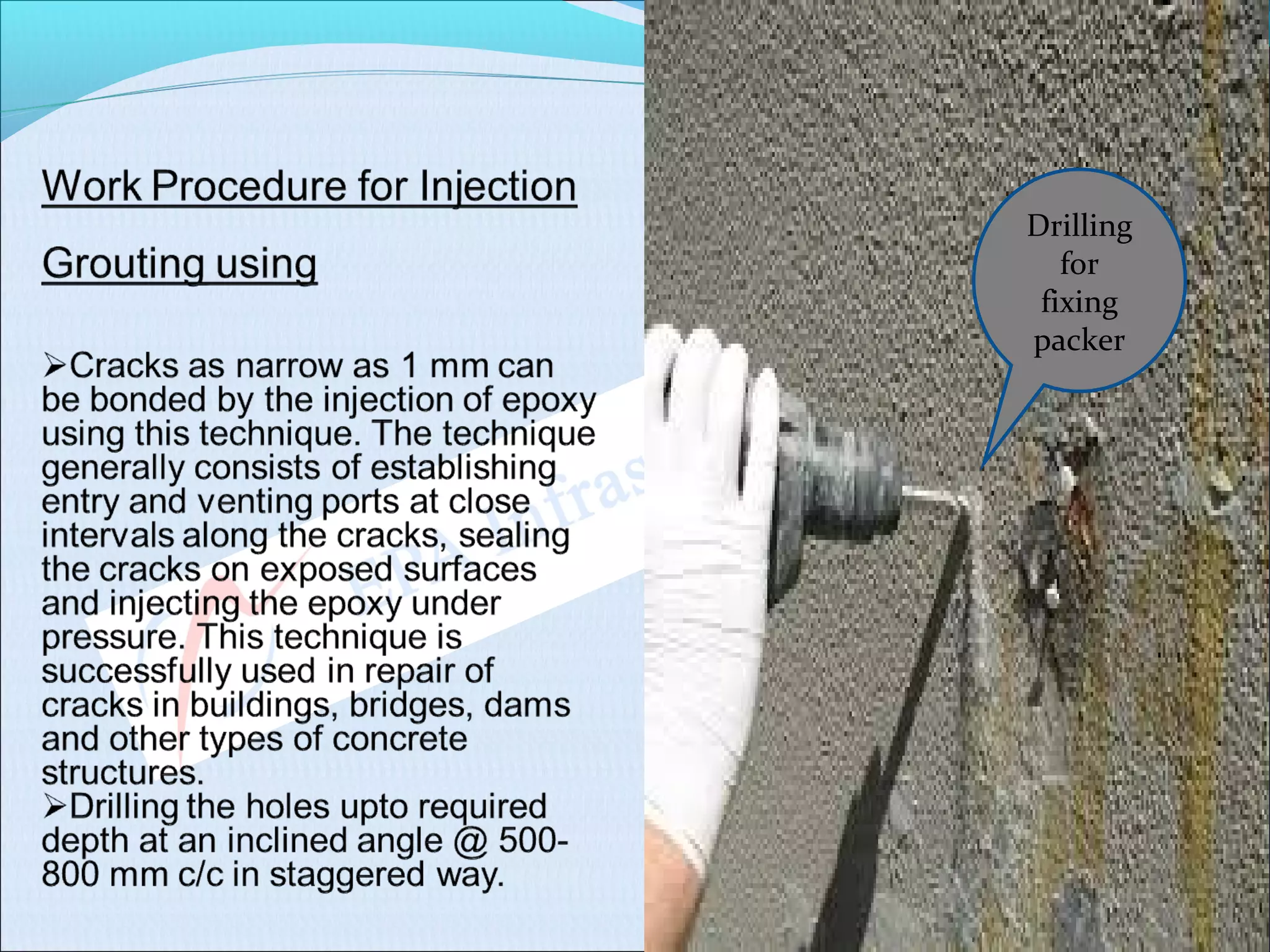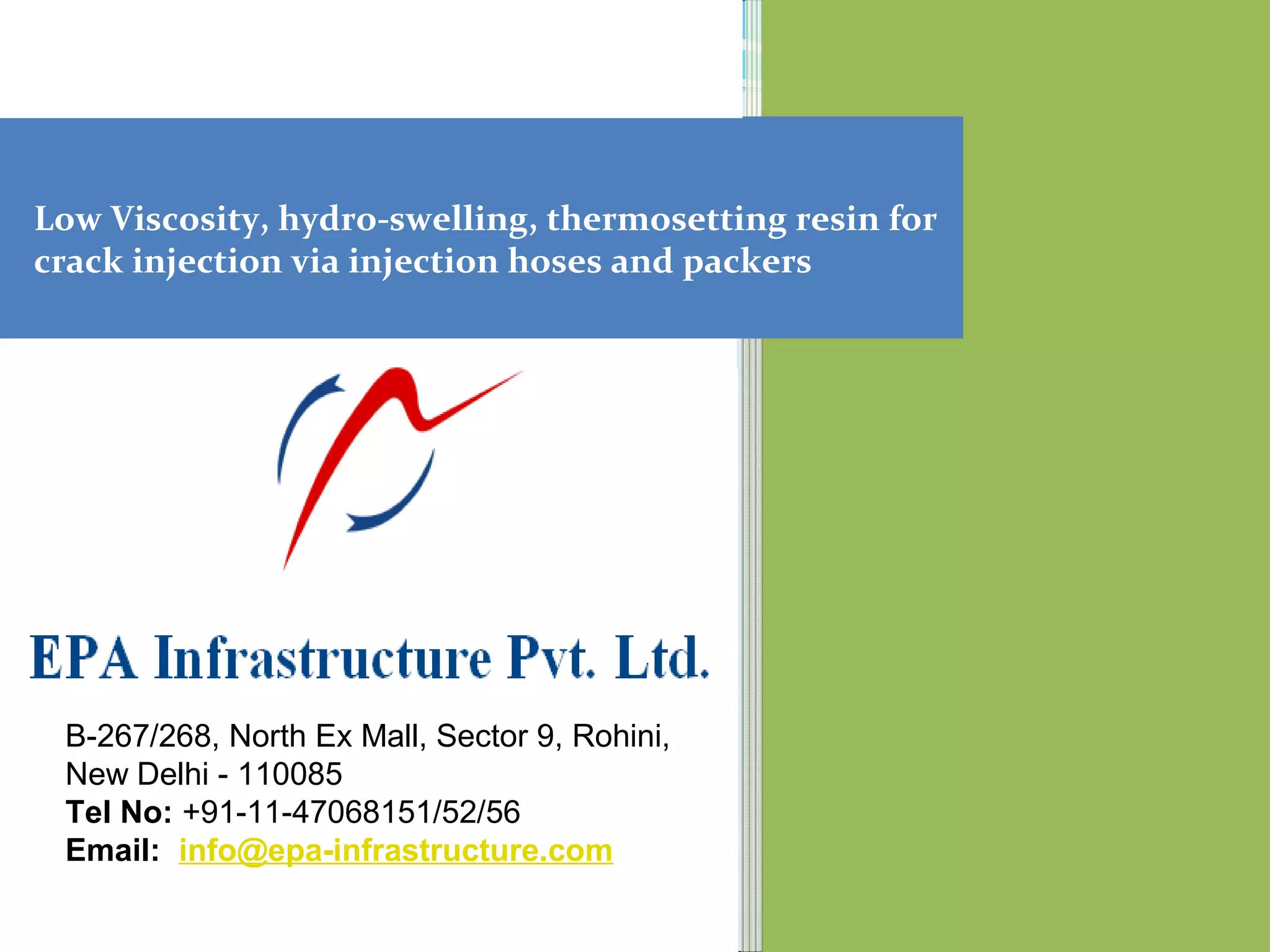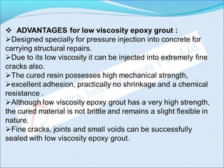 This document provides information about a low viscosity, hydro-swilling, thermosetting resin for crack injection. It lists the company contact information and provides instructions for mixing the resin components, grouting with injection equipment, and pre-processing including cleaning the area and fixing injection nipples before crack treatment.