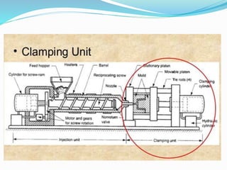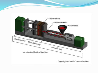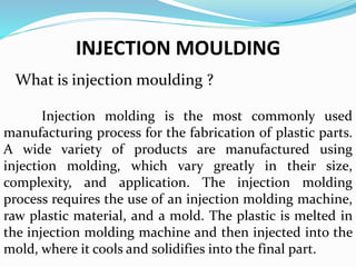 Injection molding is a widely used manufacturing process for producing plastic parts by melting raw plastic and injecting it into a mold. The process consists of four main stages: clamping, injection, cooling, and ejection, with potential defects like flash, warping, and bubbles. It is utilized in various applications, including consumer electronics, medical devices, and household items.