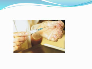The document outlines the principles of safe injections to prevent harm to patients and healthcare providers, emphasizing the necessity of standard precautions in healthcare settings. It highlights the risks associated with unsafe injection practices, including the transmission of blood-borne pathogens, and proposes prevention strategies such as vaccination of health workers and strict adherence to best practices in hand hygiene, personnel protective equipment, and waste management. Key recommendations include the use of single-use devices, proper disposal of sharps, and avoiding contamination through careful aseptic techniques.