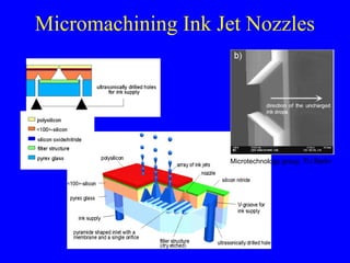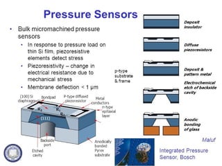 The document describes the fabrication process for a piezoresistive pressure sensor using a surface micromachined silicon wafer. The key steps include (1) thermal oxidation to grow a silicon dioxide layer, (2) boron diffusion through photolithography to form piezoresistors in the substrate, and (3) a backside etch to create a thin diaphragm over which pressure can be measured through deflection. The process uses common microfabrication techniques such as cleaning, deposition, lithography, diffusion, and etching to create a functional pressure sensor on a silicon chip for pressure sensing applications.
