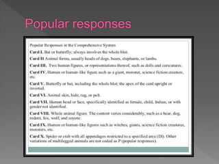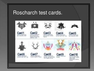 The Rorschach inkblot test consists of 10 inkblots that subjects describe in order to examine their personality and thinking processes. It was developed in the early 1900s by Swiss psychiatrist Hermann Rorschach, who was interested in how people perceive ambiguous images. The test administration involves 4 phases - introduction, response, inquiry, and interpretation of codes assigned to the responses. Responses are analyzed both qualitatively and quantitatively to derive scores related to various personality characteristics.