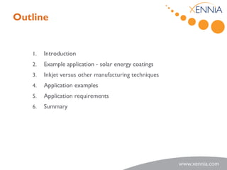 Xennia Technology Ltd presents inkjet printing as a revolutionary method for manufacturing advanced functional coatings, especially in solar energy applications. The company emphasizes its unique expertise and solutions to lower costs, increase productivity, and enable mass customization through inkjet technology. With a focus on developing reliable ink formulations and scalable processes, Xennia aims to drive efficiencies in the photovoltaic market and explore collaborative projects for innovative advancements in printed electronics.