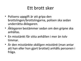 Forts. Ett brottsker En person får sitta anhållen i fyra dygn. För att få fortsätta sitta inne ytterligare tid måste personen häktas. Häktning beslutas av domstolen. Att de olika sakerna som sker är uppdelade på olika myndigheter gör att rättssäkerheten ökar.