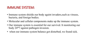 This document summarizes innate and adaptive immunity. It explains that innate immunity is the first line of defense and is non-specific. It acts through physical, biochemical, and genetic factors like skin, mucous membranes, tears, and species immunity. Adaptive immunity is antigen-specific and develops immunological memory. It includes natural adaptive immunity gained from infection or passive transfer of antibodies from mother to child, and artificial adaptive immunity from vaccination or monoclonal antibody therapy.