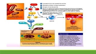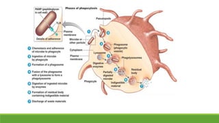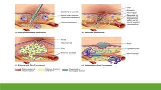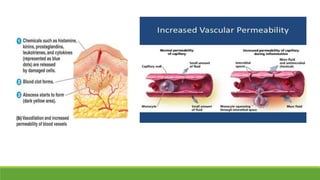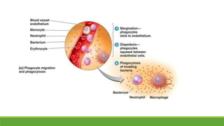 Immunity is the body's defense mechanism against foreign bodies like bacteria, viruses, and toxins. Innate immunity provides immediate protection through physical and chemical barriers like the skin and mucous membranes, as well as white blood cells that phagocytose pathogens. The complement system and interferons are also part of innate immunity. When barriers are breached, inflammation occurs, attracting more immune cells to the site of infection to destroy pathogens and repair tissue damage.