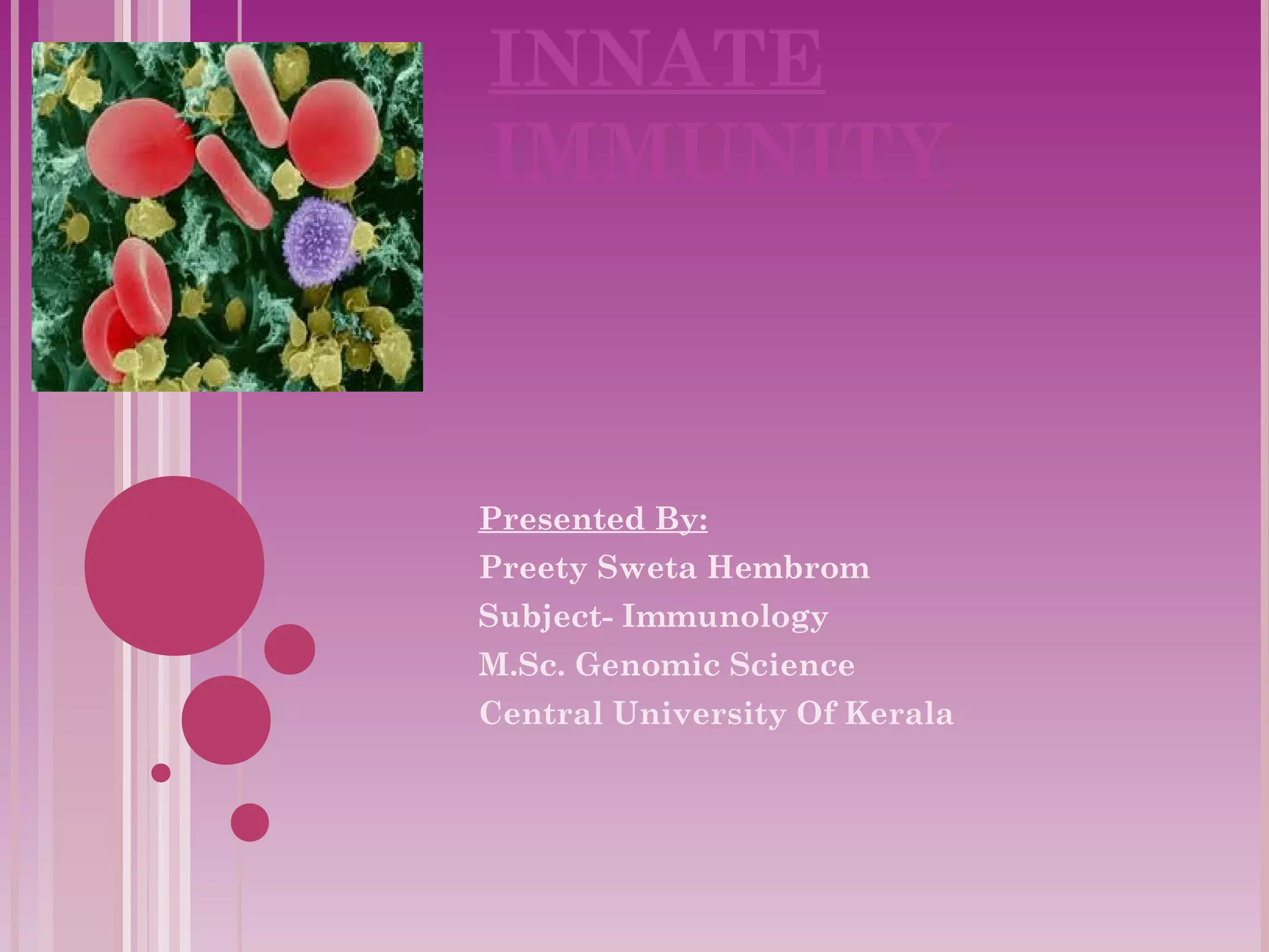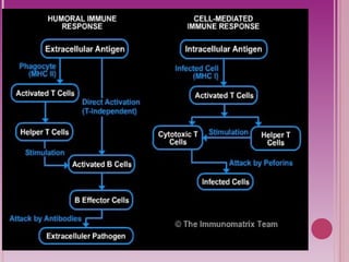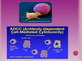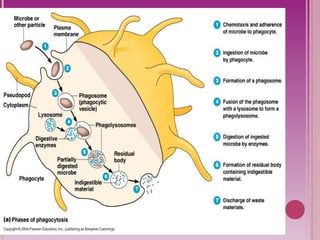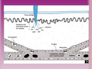 The document summarizes innate immunity. It describes innate immunity as the non-specific first line of defense against infection found in all living organisms. This includes anatomical barriers like skin and mucous membranes, chemical inhibitors like stomach acid, and microbial flora. The second line of innate immune defense includes natural killer cells and phagocytes that attack pathogens. Soluble factors like complement proteins and cytokines also help innate immunity, as does the inflammatory response to infection and tissue damage.