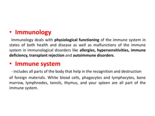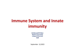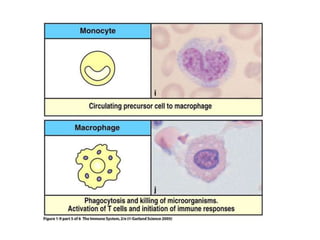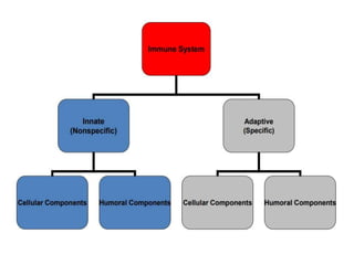The document discusses the components of the innate immune system. It describes the physical, chemical, biological, and physiological barriers that block pathogens from entering the body. It also explains the cellular responses involving phagocytes that destroy pathogens through phagocytosis. The complement system and inflammatory response are blood proteins and processes that help eliminate pathogens. Key cells of innate immunity discussed are neutrophils, macrophages, dendritic cells, and natural killer cells.