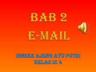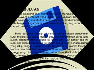 Dokumen tersebut menjelaskan tentang penggunaan dan cara kerja email (surat elektronik) mulai dari penjelasan tentang prinsip kerja email yang mirip dengan pengiriman surat konvensional melalui pos namun lebih cepat, bagian-bagian dari alamat email, jenis-jenis email, cara membuat akun email, dan cara mengoperasikan email untuk membuat, membaca, dan membalas pesan email.