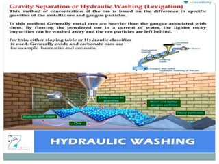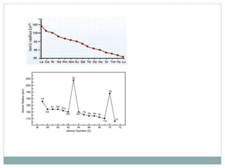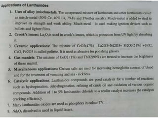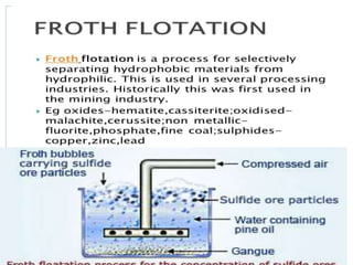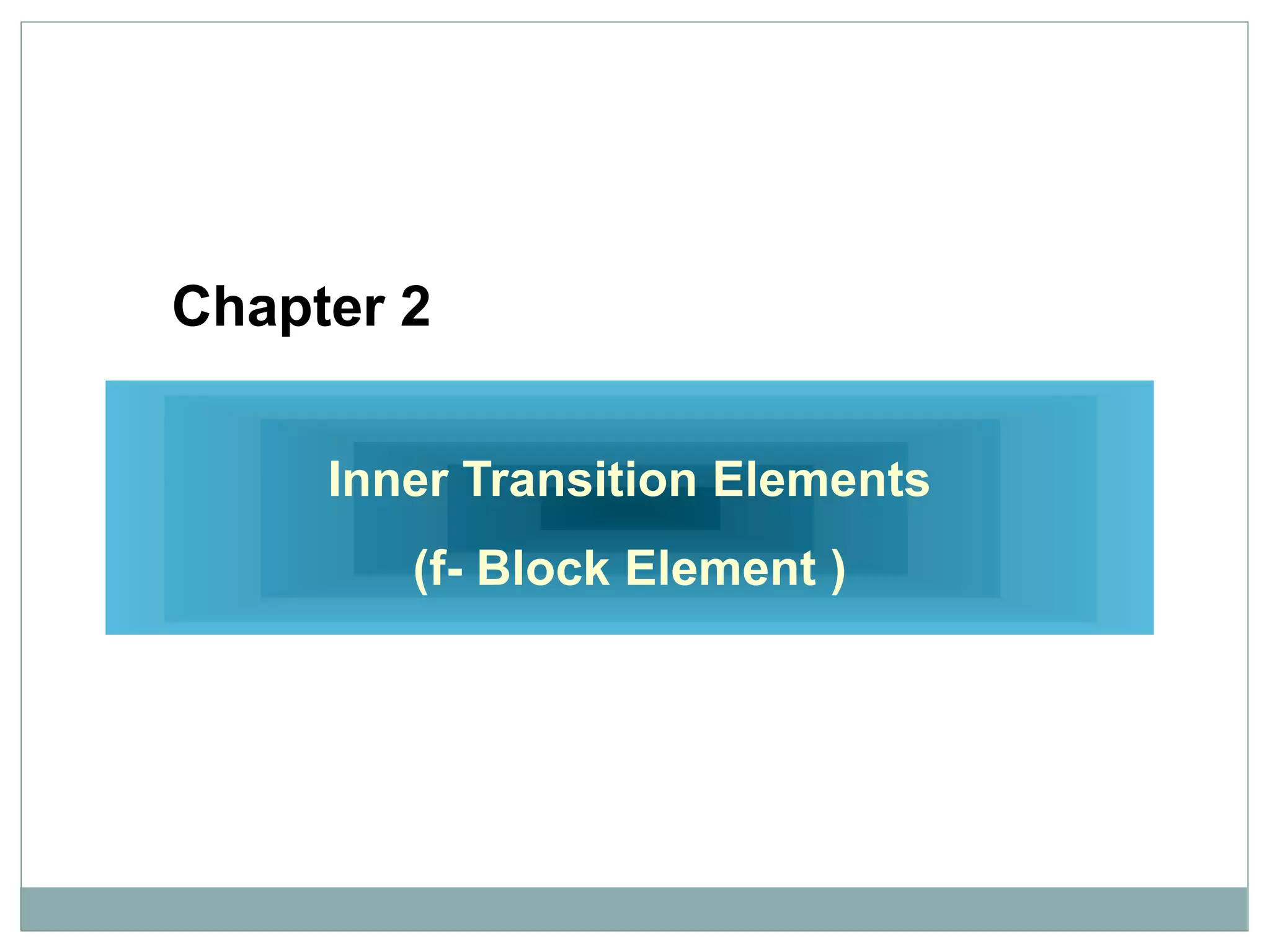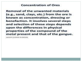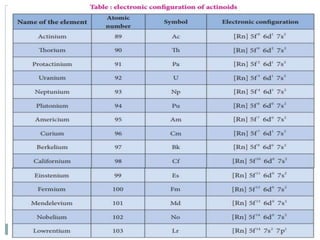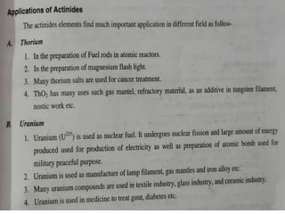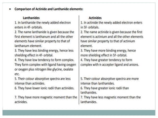 The document discusses inner transition elements (f-block elements) and actinides. It provides definitions and general properties of actinides. Actinides have the electronic configuration of 2,8,18,32,5s2,p6d10f0-14,6s2p6d0-2,7s2. Their common oxidation states are +2, +3, +4, +5, +6 and, in some cases, +7. The document also discusses metallurgy and describes the steps involved - crushing/pulverization, concentration, calcination, roasting, smelting and refining. Finally, it explains the differences between pyrometallurgy and