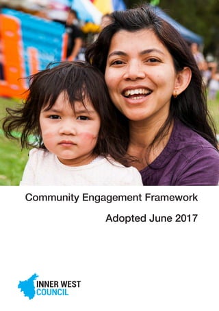 The Inner West Council's Community Engagement Framework, adopted in June 2017, outlines the council's commitment to integrating community input in decision-making processes to enhance local democracy and well-being. It incorporates principles of effective engagement, aiming to ensure diverse perspectives are represented and community needs are understood while fostering transparency and building trust. The framework is informed by best practices and will be reviewed regularly to stay current with legislative changes and community expectations.