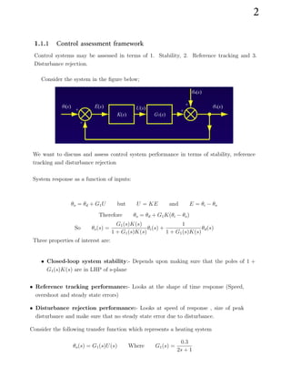 The document discusses control system assessment in terms of stability, reference tracking, and disturbance rejection. It provides an example of assessing the performance of a heating system controlled with a proportional controller. The key points are: