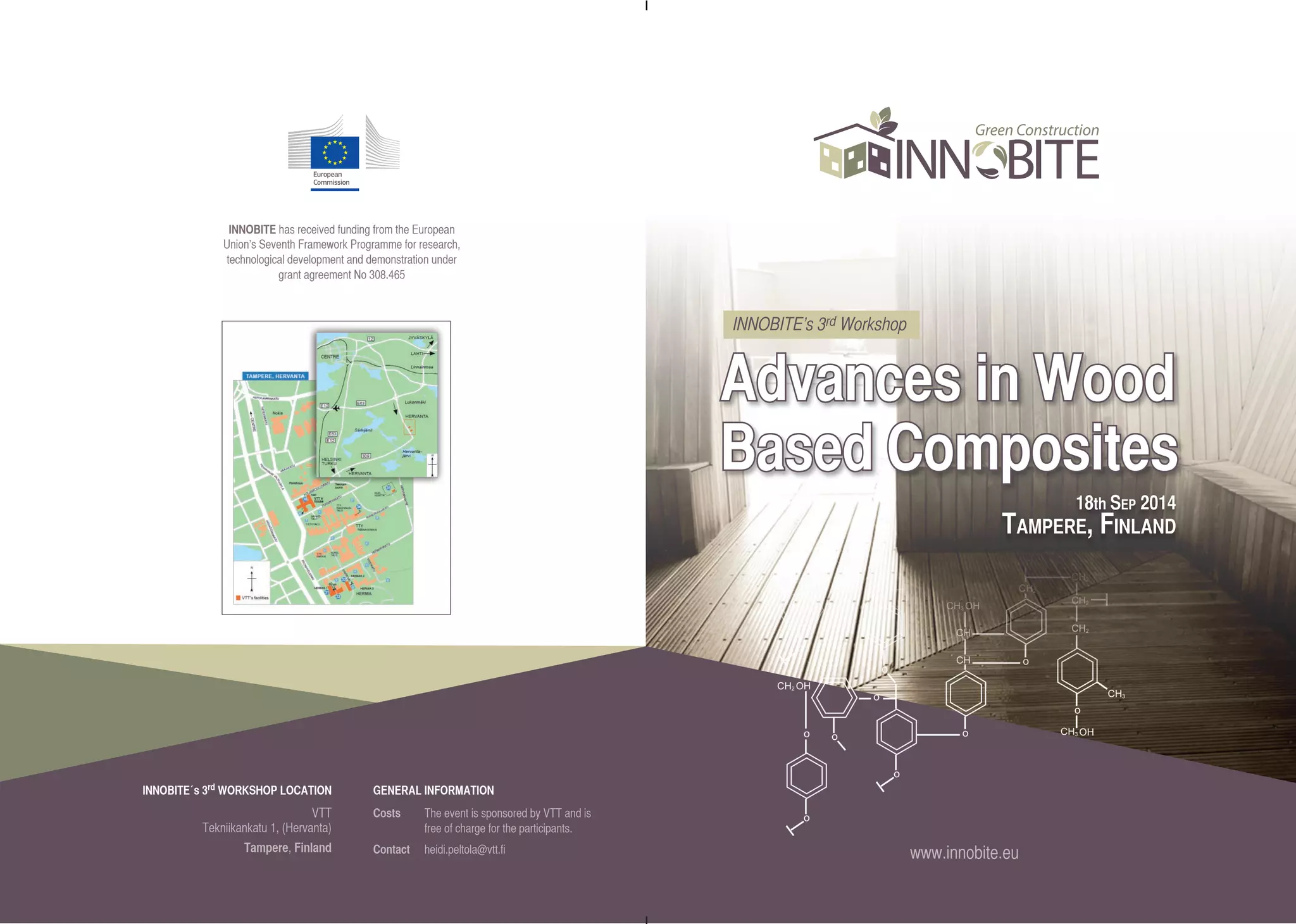The Innobite project is hosting its 3rd workshop on September 18, 2014, in Tampere, Finland, focusing on advancements in wood-based thermoplastic biocomposites for the construction sector. The project aims to enhance the valorization of urban and agricultural residues, developing bio-based materials and composites for producing sustainable building components. Key topics include market opportunities, sustainability, and recent scientific developments in the field, with a goal of achieving over 95% bio-based content in products.