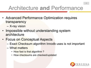 This document provides an overview of the Innodb architecture and performance optimization. It discusses the general architecture including row-based storage, tablespaces, logs, and the buffer pool. It covers topics like indexing, transactions, locking, and multi-versioning concurrency control. Optimization techniques are presented such as tuning memory configuration, disk I/O, and garbage collection parameters. Understanding the internal workings is key to advanced performance tuning of the Innodb storage engine in MySQL.