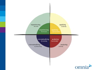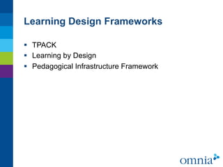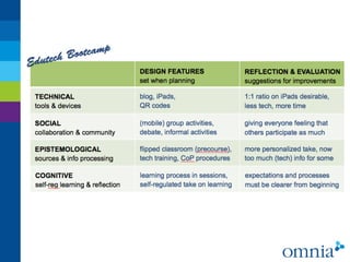 The document discusses best practices for blending technology, entrepreneurship, and learning design. It analyzes the essential design features and shortcomings of settings that incorporate technical, social, and epistemological components. These include the use of various mobile apps, cloud services, social media, and group activities. The design emphasizes blended learning through multiple sources and actors, with flexibility. It encourages knowledge sharing through communities of practice and knowledge building communities. An example discussed is an Edupreneur Bootcamp program that guides students on a journey to entrepreneurship.