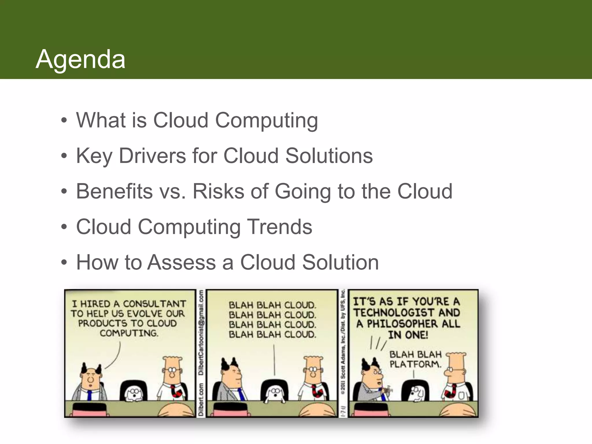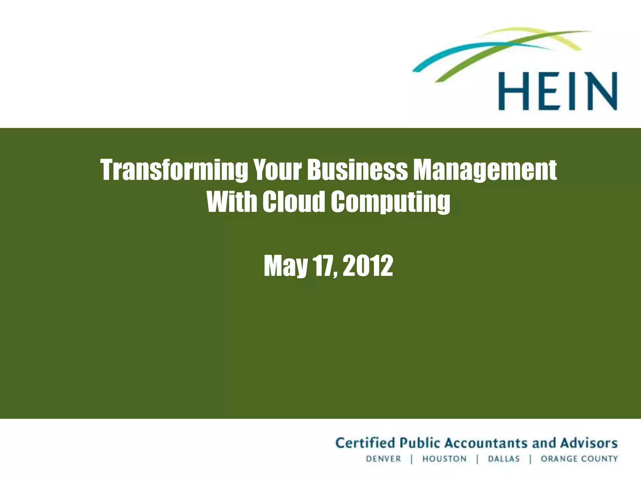 This document discusses how cloud computing can transform business management. It begins by defining cloud computing and outlining the key drivers, benefits, and risks of adopting cloud solutions. It then examines cloud computing trends and how to assess cloud solutions. The document provides an overview of different cloud deployment models (public, private, hybrid) and service models (SaaS, PaaS, IaaS). It argues that cloud computing enables benefits like streamlining processes, lowering costs, and supporting distributed organizations. However, security, availability, and regulatory compliance present challenges that must be addressed when evaluating cloud providers.
