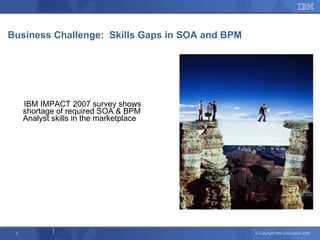 The document discusses the skills gap in Service-Oriented Architecture (SOA) and Business Process Management (BPM) identified in a 2007 IBM survey, highlighting the need for targeted training through innovative methods. It emphasizes the use of serious games, specifically the 'Innov8' simulation game, to teach SOA and BPM skills to MBA students and professionals, aiming to bridge the identified skills gap. The document details the game's objectives, its incorporation into various academic curriculums, and its effectiveness in enhancing learning outcomes across a wide range of educational institutions.