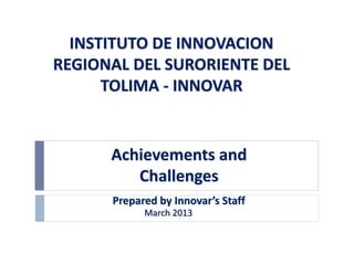 The document discusses the achievements and challenges of the Instituto de Innovación Regional del Suroriente del Tolima (Innovar) in Colombia, focusing on educational and developmental initiatives in the region. It highlights Innovar's mission to provide opportunities for knowledge acquisition and community capacity building, while addressing issues such as poverty and regional inequity. The document also outlines the organization's educational programs, enrollment statistics, and proposals for expansion and improvement in technological education offerings.
