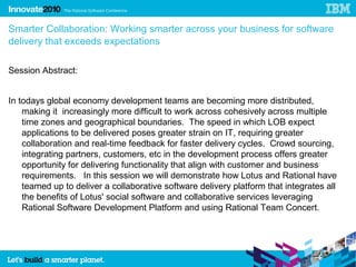 The document discusses a new collaborative software delivery platform that integrates Lotus Connections' social and collaborative capabilities with Rational Team Concert and the Rational Software Development Platform to enable improved collaboration across distributed software development teams and geographies. An example use case is provided that demonstrates how various IBM collaboration tools can be used together to support a social software development process.