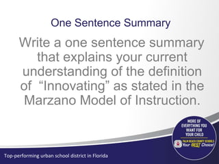 The document outlines a framework for innovation in teaching within a top-performing urban school district in Florida, emphasizing the importance of monitoring student learning based on standards. It defines innovating as ensuring that 100% of students meet desired outcomes and adapting strategies for those who do not. Key steps include creating standards-based lessons, planning monitoring techniques, and preparing adaptations for unique student needs.