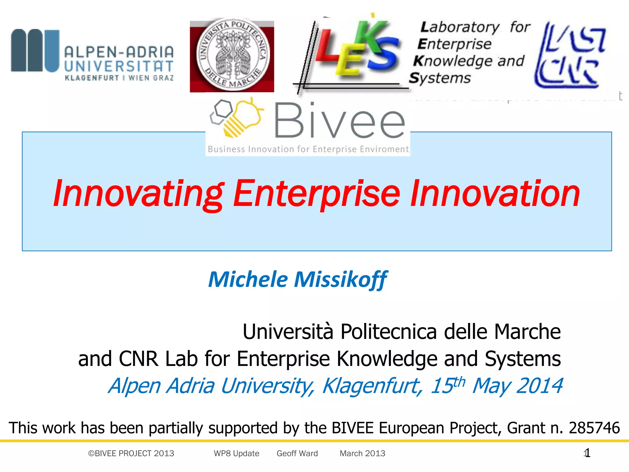 The document discusses the importance of innovation in complex organizations and how it is necessary for European enterprises to adapt and remain competitive in a globalized economy by focusing on sustainable innovation. It highlights a systematic approach to innovation called the Virtual Innovation Factory (VIF) that emphasizes collaboration, knowledge management, and the integration of human and technological resources. Key elements of business innovation are outlined, emphasizing the need for continuous improvement and a shift in how organizations perceive and implement innovation.