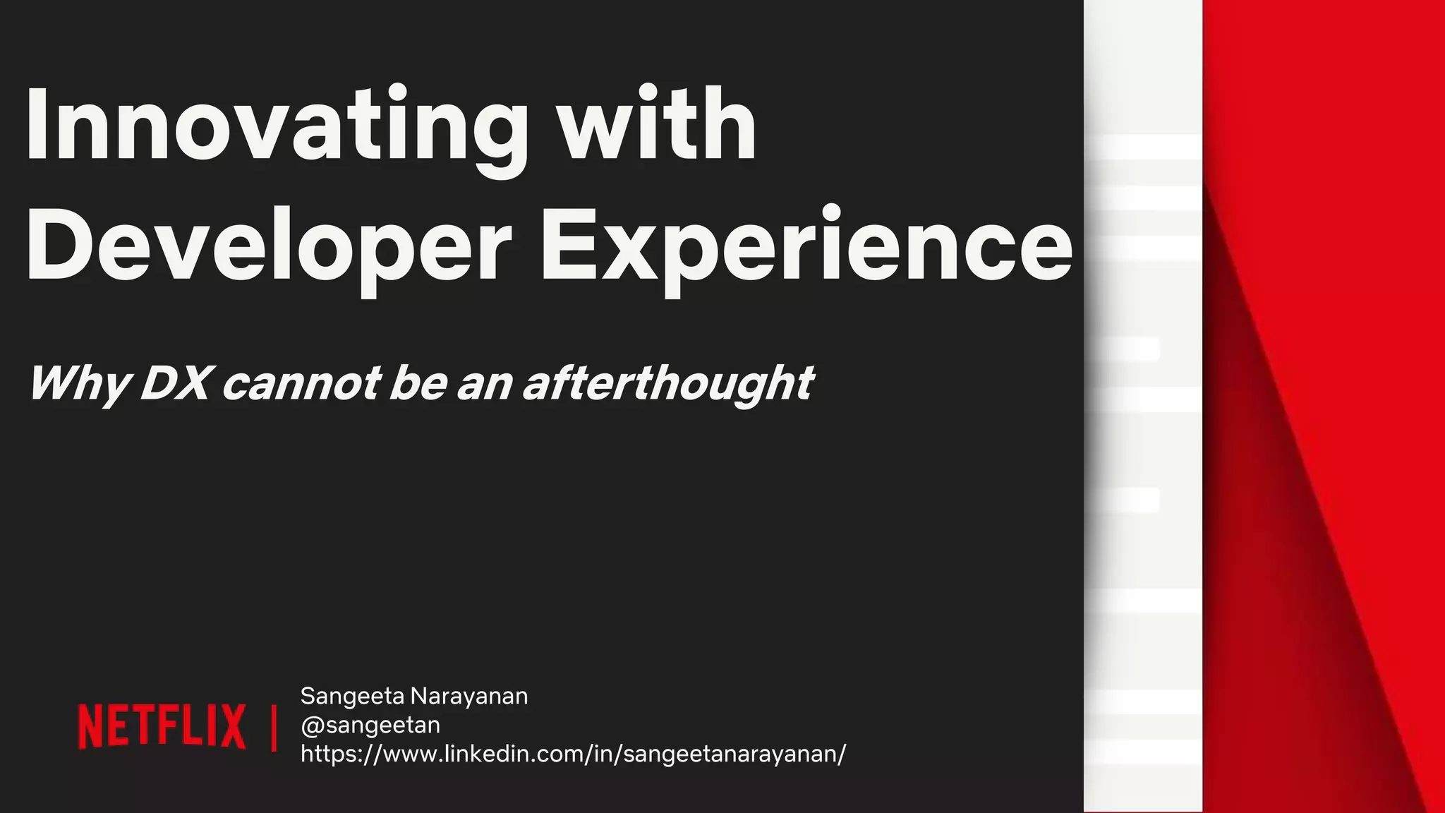 The document discusses how developer experience (DX) is crucial for innovation and cannot be an afterthought. It explains that companies innovate to stay ahead of competitors and adapt to changes. Successful companies empower developers by having a culture that encourages risk-taking, diverse opinions, and autonomy, and technology that allows rapid experimentation and deployment. The document uses Netflix as a case study, describing its culture of "people over process" and technological architecture that gives developers short routes to production while providing operational insights.