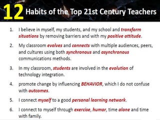 The document discusses technical skills and expectations of students in the 21st century. It defines technical skills as the basic knowledge required to perform tasks, including educational qualifications. It also outlines students' expectations such as customization, collaboration, speed, and innovation. The document then recommends ways for teachers to cater to students' needs, including creating authentic learning experiences, lessons with emotional connections, and personalized learning opportunities. Finally, it outlines specific 21st century skills students should learn, such as using the internet, office suites, social media, typing, analytical thinking, and communication skills.