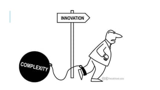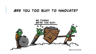 The document discusses innovation and innovative practices. It defines innovation as translating an idea into a good or service that creates value by satisfying needs. Innovation can be evolutionary through incremental changes or revolutionary through disruptive changes. The document recommends surrounding oneself with diverse thinkers and using engaged and active learning strategies to be more innovative. It provides examples of innovative educational practices and resources that use different types of learning like art-based, brain-based, and competency-based approaches.