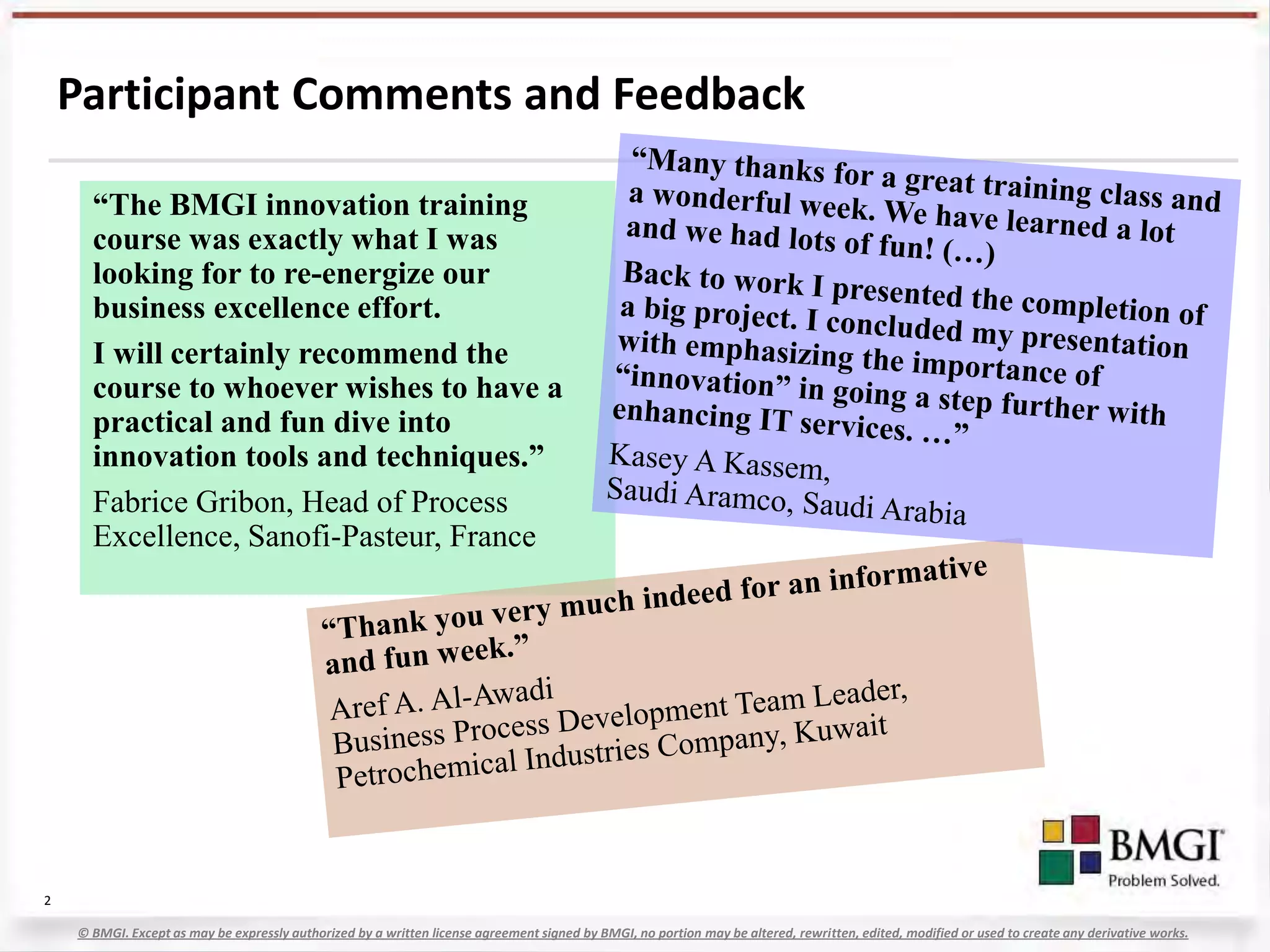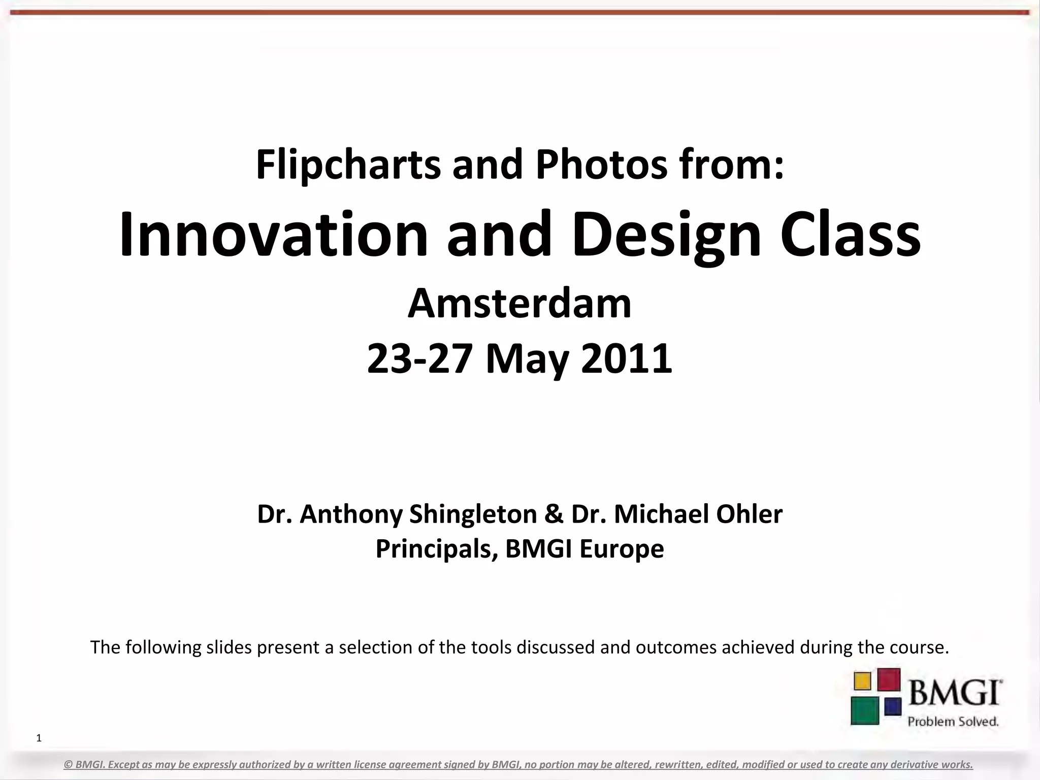 The document summarizes an innovation and design class held in Amsterdam from May 23-27, 2011. It provides feedback from participants who found the training energizing and practical. The class covered various innovation tools and techniques like brainstorming, identifying jobs-to-be-done, spotting opportunities, and using tools like morphological matrices and TRIZ. Participants innovated around everyday objects and learned approaches from a design company. At the end of the class, participant expectations were assessed as largely meeting goals with no negative feedback.