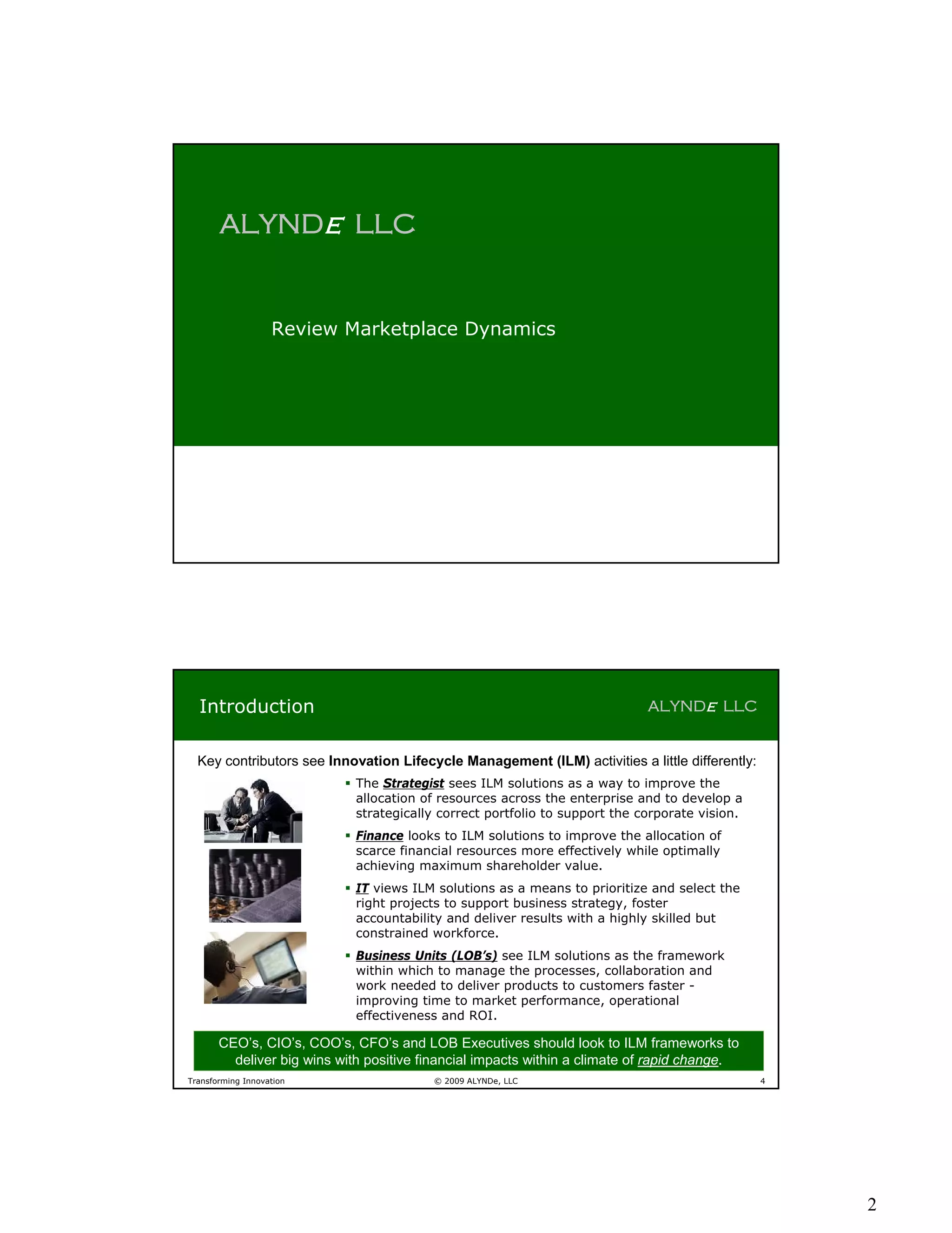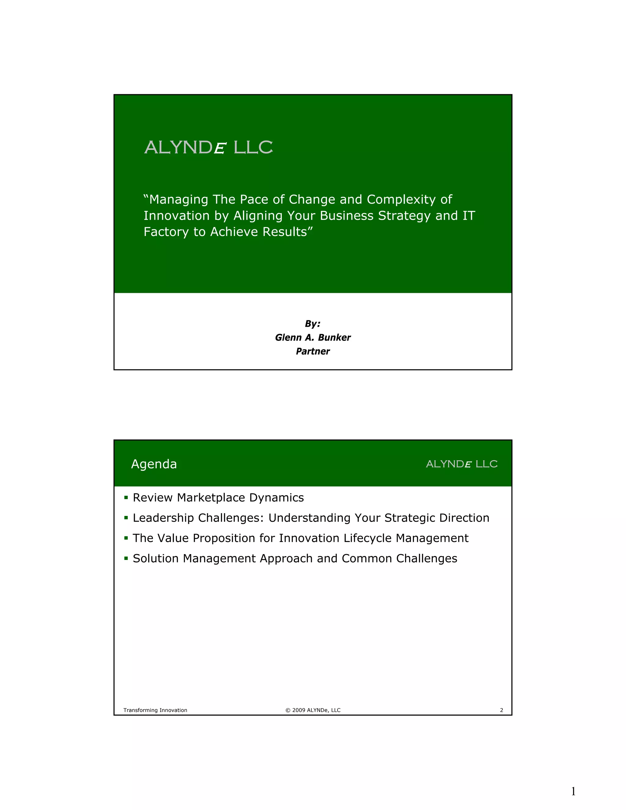 The document outlines the importance of aligning business strategy with innovation lifecycle management (ILM) to enhance operational effectiveness and drive business growth in a rapidly changing marketplace. It discusses the pressures organizations face, leadership challenges, and the need for effective governance and decision-making frameworks. The document advocates for adopting best practices in project and resource management to achieve measurable business value and support proactive decision-making.